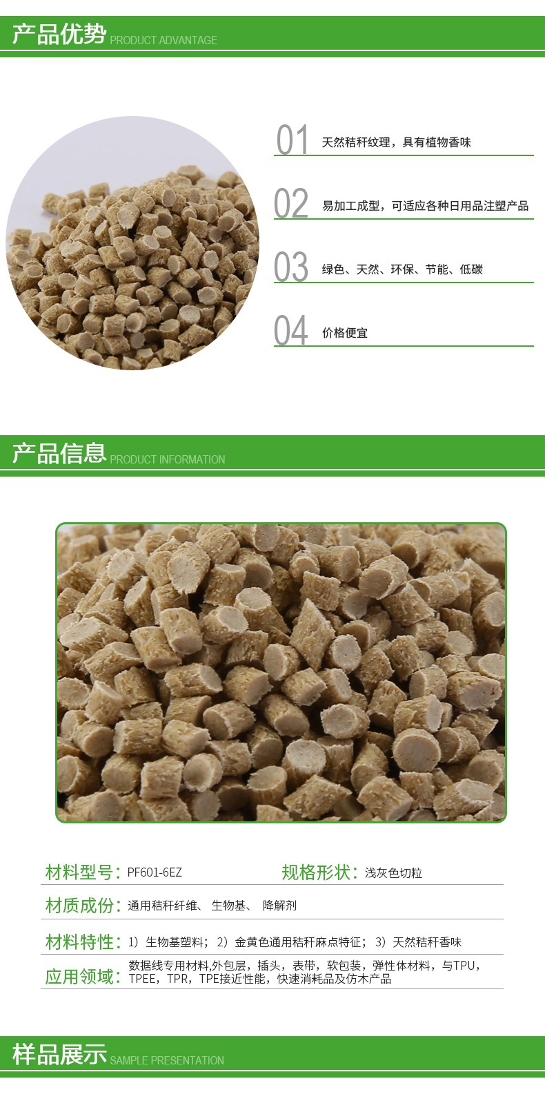 秸桿復(fù)合材料是由秸桿、稻殼、淀粉、竹粉、木粉等天然可再生植物纖維與離分子樹脂經(jīng)特殊工藝復(fù)合而成的新型綠色環(huán)保復(fù)合材料,具有與普通熱塑性塑料相關(guān)類似的性能,適用于各類注塑品加工。